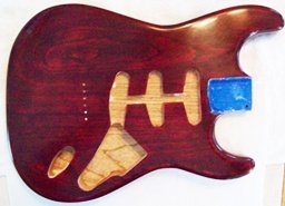 UPDATE: Here is the guitar body with stain and fifteen coats of lacquer. The body has been sanded down in steps, with the final sand using 2000 grit paper. I'm in the process of using some light polishing compound, and will soon go to finishing compound and wax. I'm guessing the entire guitar will be completed by the end of next week. Check back for updates. J.B.