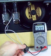 Take a look at the picture above with the meter. Next to the meter is a tube bias tester, get one of these, it may save your life. This allows you to plug the tubes into the tester, then plug the tester into the amp's tube slots. There is a switch box that has a one ohm shunt resistor, this allows you to measure the tube amperage in milli-volts, and switch between the tubes for bias testing.